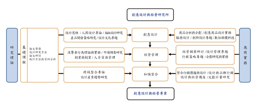 (1)知識整合與設計思維能力;(2)數位行銷與品牌經營能力;以及(3)創意激發與創業管理能力等之核心能力,並以培育具備整合「創意設計」與「經營管理」之跨領域高階人才為教育目標。本研究所為配合國內設計產業發展趨勢與人才需求,根據本研究之發展定位,擬定以「創意設計」與「創新經營」及「知識整合」為發展重點,未來發展架構如圖所示。